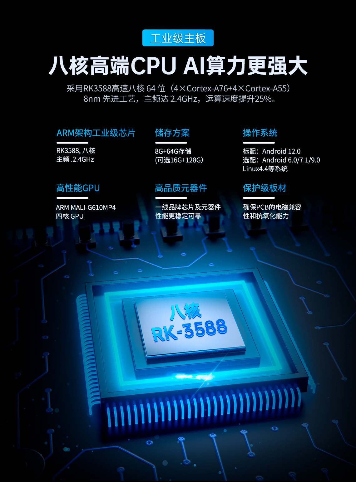 采用RK3588高速八核64位,8nn先進工藝,主頻2.4G Hz,運算速度提升25%