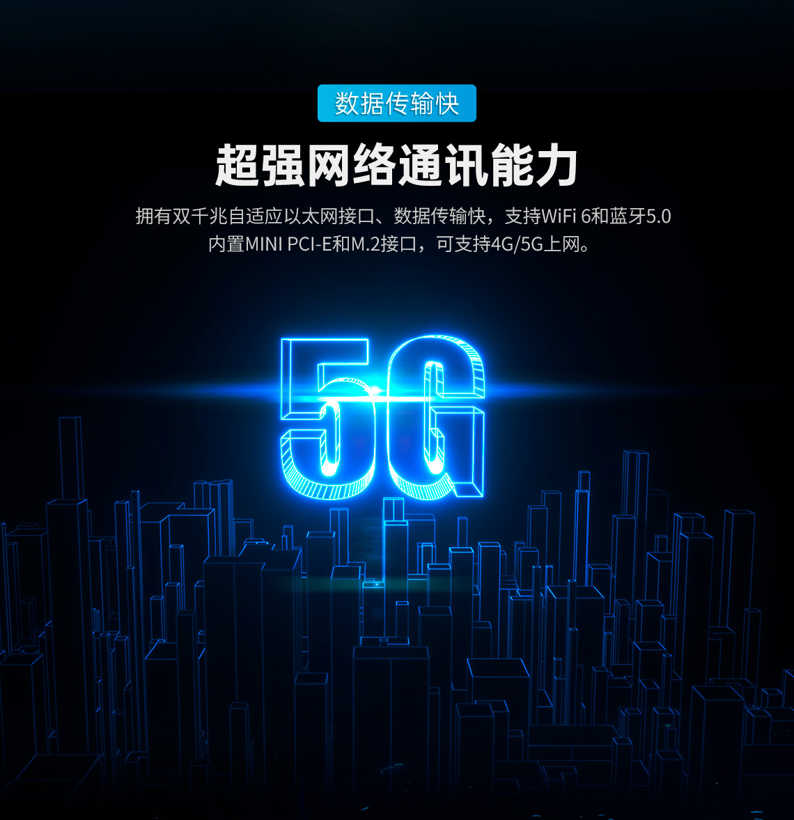 擁有雙千兆自適應以太網接口、數據傳輸快,支持WIFI 6 和藍牙 5.0,內置MINI PCI-E和M.2接口,可支持4/5G上網