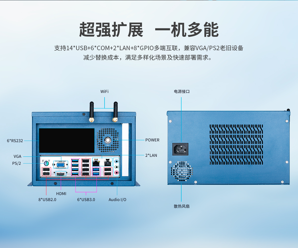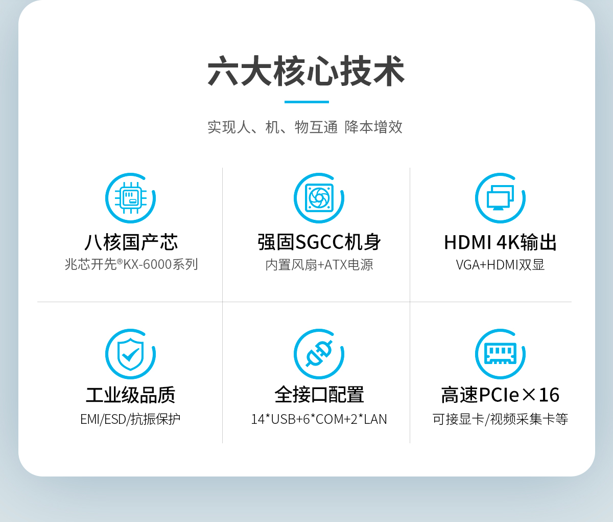 1.八核國產芯 2.強固SGCC機身 3.HDMI4K輸出 4.工業級品質 5.全接口配置 6.高速PClex16